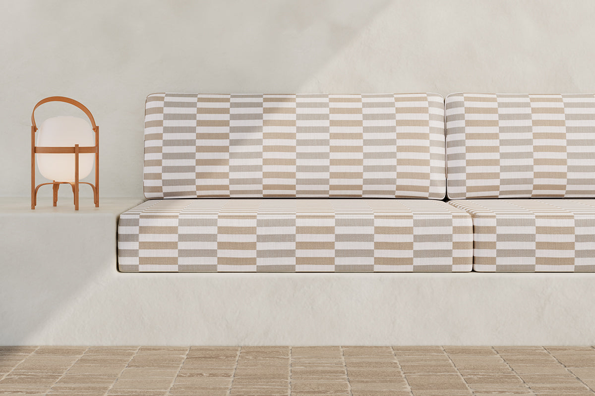 to what matters. Structured as a grid, its woven patch motif echoes handwork; intentionally imperfect, deeply human. With subtle irregularities and a softened palette, Mending speaks to a growing desire for simplicity, tactility, and things that endure.