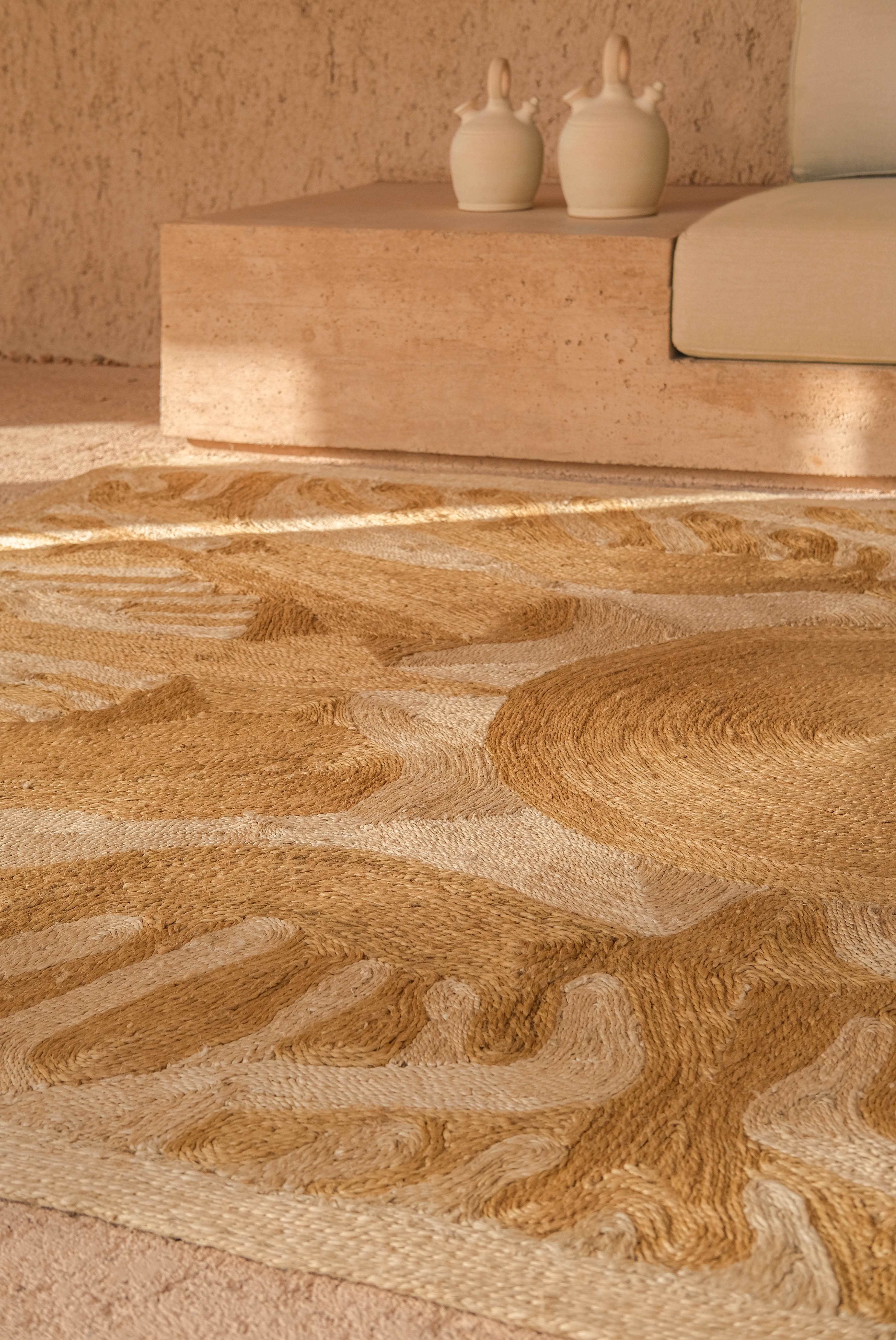 The collection brings together a range of techniques such as hand tufted, hand knotted, hand loomed, and embroidery alongside new developments such as sculptural tufting and hand-braided, hand-stitched jute. Only natural fibers are used, including hand-spun Afghan wool, New Zealand wool, and jute, combined in varying densities to enhance texture, color, and depth.
