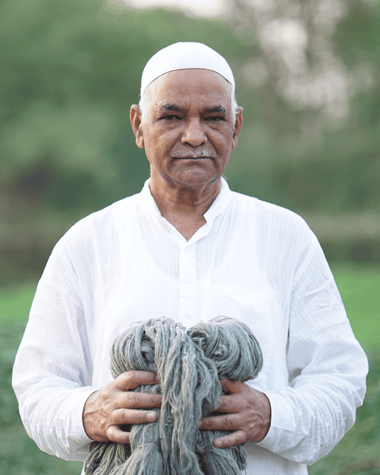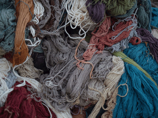 We make the yarn by hand from recycled fiber through a spinning and stretching process.