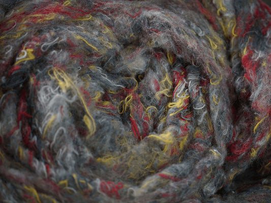 The more we shredded and mixed the colored wools, the greyer the fibers became; and conversely, the less we shredded them, the more tonal and random richness we achieved.