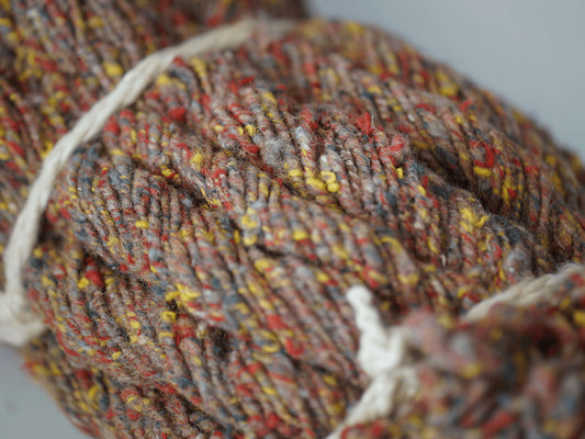 The resulting five yarns range from the greyest to the most colorful. We achieved this color degradation by regulating the degree of wool shredding.