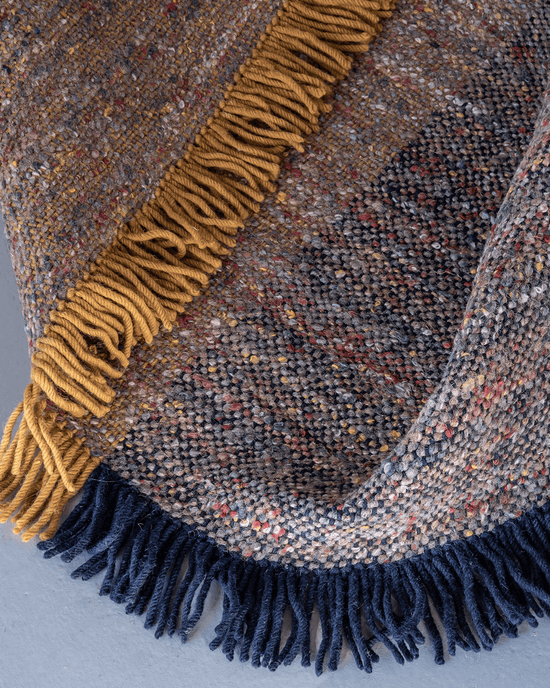 The Re-Rug collection is made using the hand-loomed dhurrie technique, resulting in rugs with a flat structure formed from the cross between the warp and weft. In the case of Re-Rug, in order to obtain greater strength and quality, the structural part of the rug, i.e. the warp, is made of New Zealand virgin wool dyed black and white, yellow or blue. And in the weft, the marbled recycled yarn of varying thickness and color.
