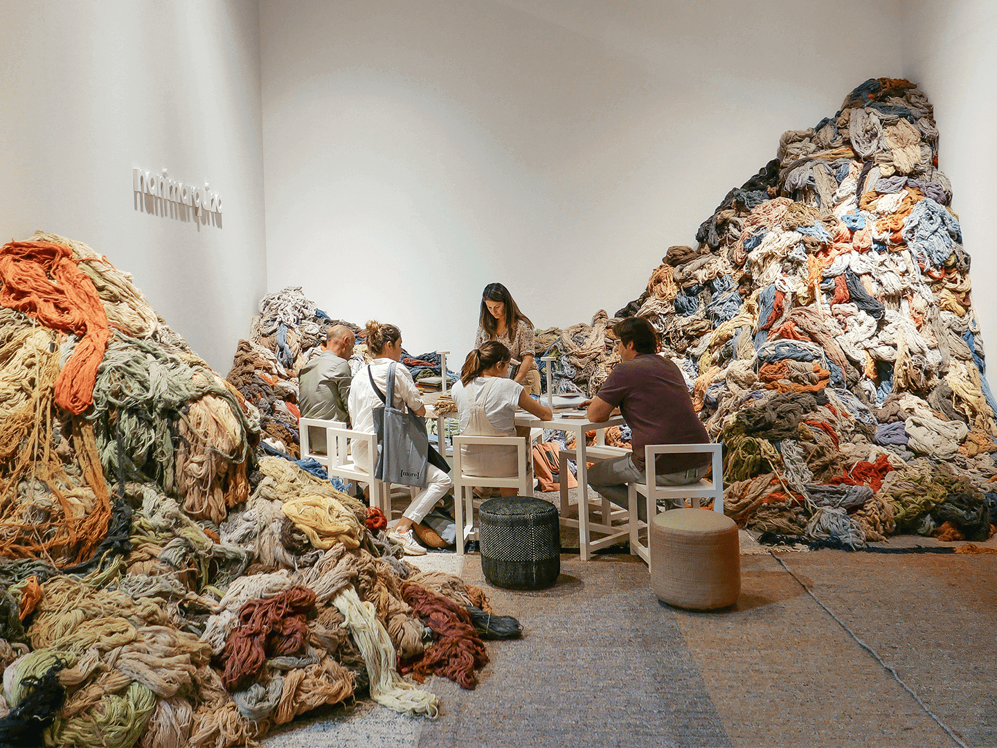 The stand, a new way of looking at waste, was an example of transparency and sustainability. Designed by ARQUITECTURA-G , it was divided into two different spaces. The main space was made up of mountains of wool, the actual sample of the reclaimed wool to design Re-Rug. And the second space, smaller in size, was a place to see the new collections first-hand. From Tones by Claudia Valsells, Troupe by Jaime Hayon to Tiles and Ceras by Nani Marquina. We also present the new models of poufs, Tres pouf Outdoor and Shade Pouf Outdoor , created to respond to the strong demand for seats also for outdoor use.