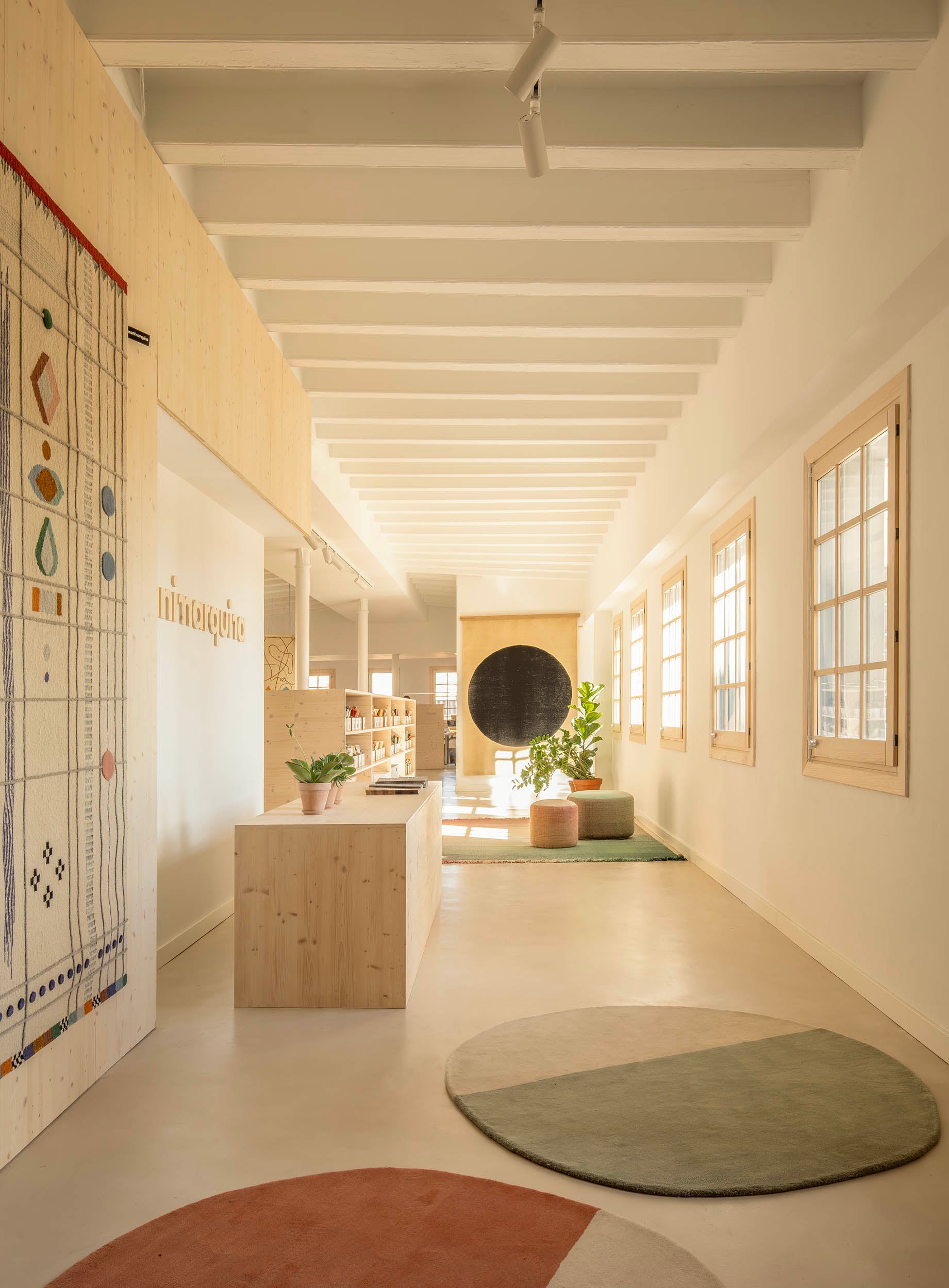 Inspired by the aesthetics of natural, pure materials, with clear influences from Mediterranean and Nordic design, the project aimed to create a functional, comfortable, and healthy workspace, with efficient climate control, proper soundproofing, and maximum well-being. Abundant natural light floods the interiors, highlighting the warmth of pine wood and the neutrality of beige microcement, materials chosen to keep the atmosphere light and understated, allowing the nanimarquina rugs to become the true protagonists of space.