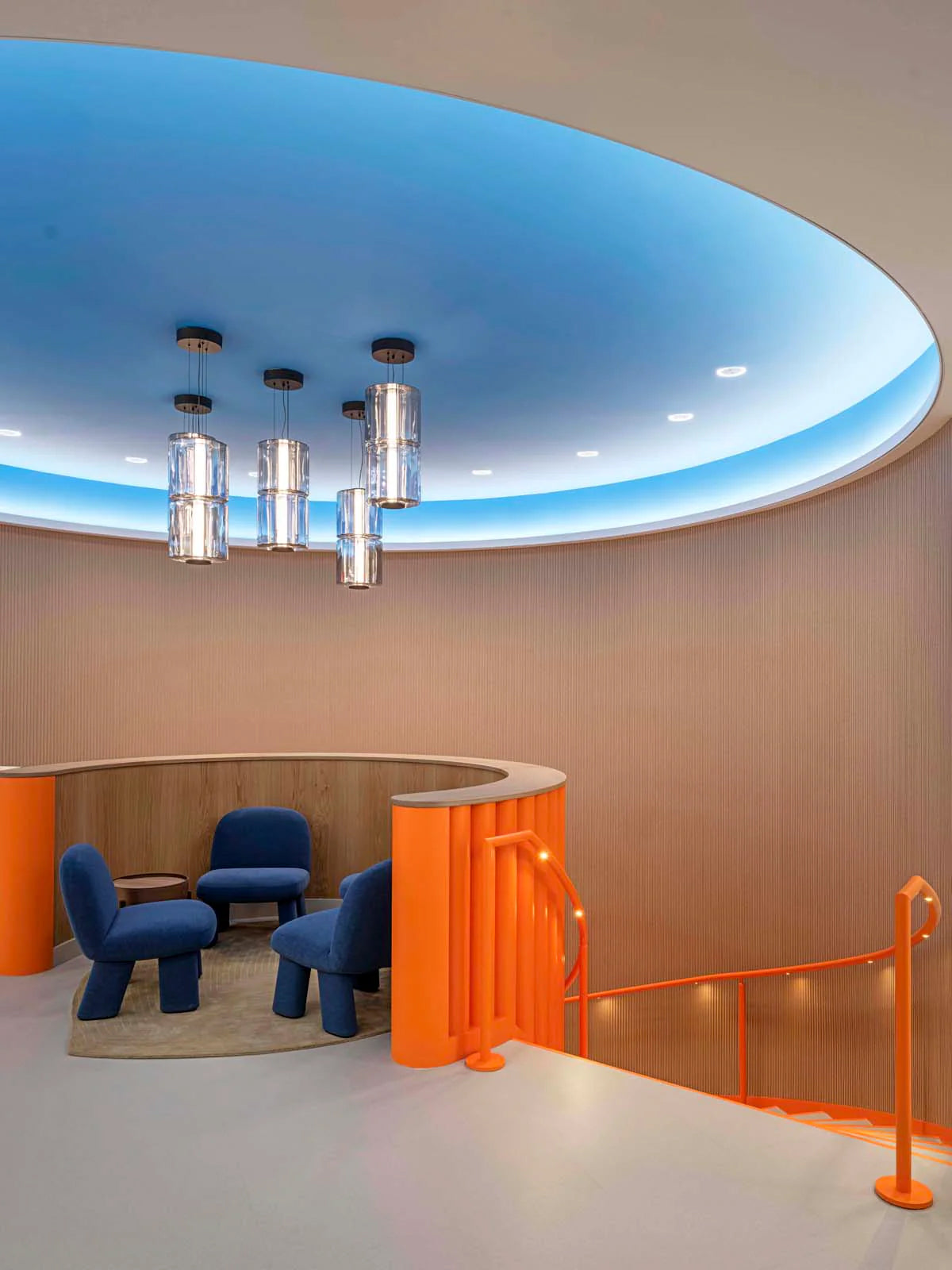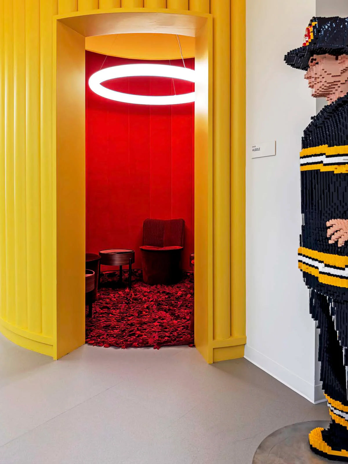 Everything plays here. Color takes on a central role within the interiors: bold yet carefully balanced palettes reference iconic LEGO® bricks while maintaining the sophistication expected of a world-class office headquarters. Texture and materiality introduce warmth, while carefully considered acoustic strategies enhance comfort, reinforcing the idea that productivity thrives in inspiring environments.