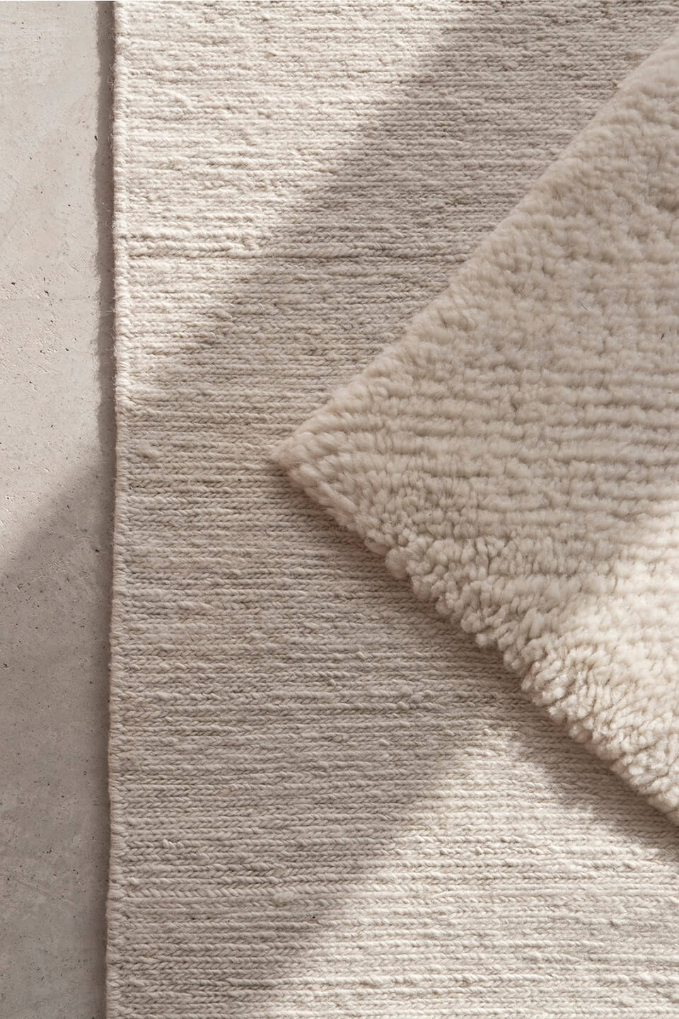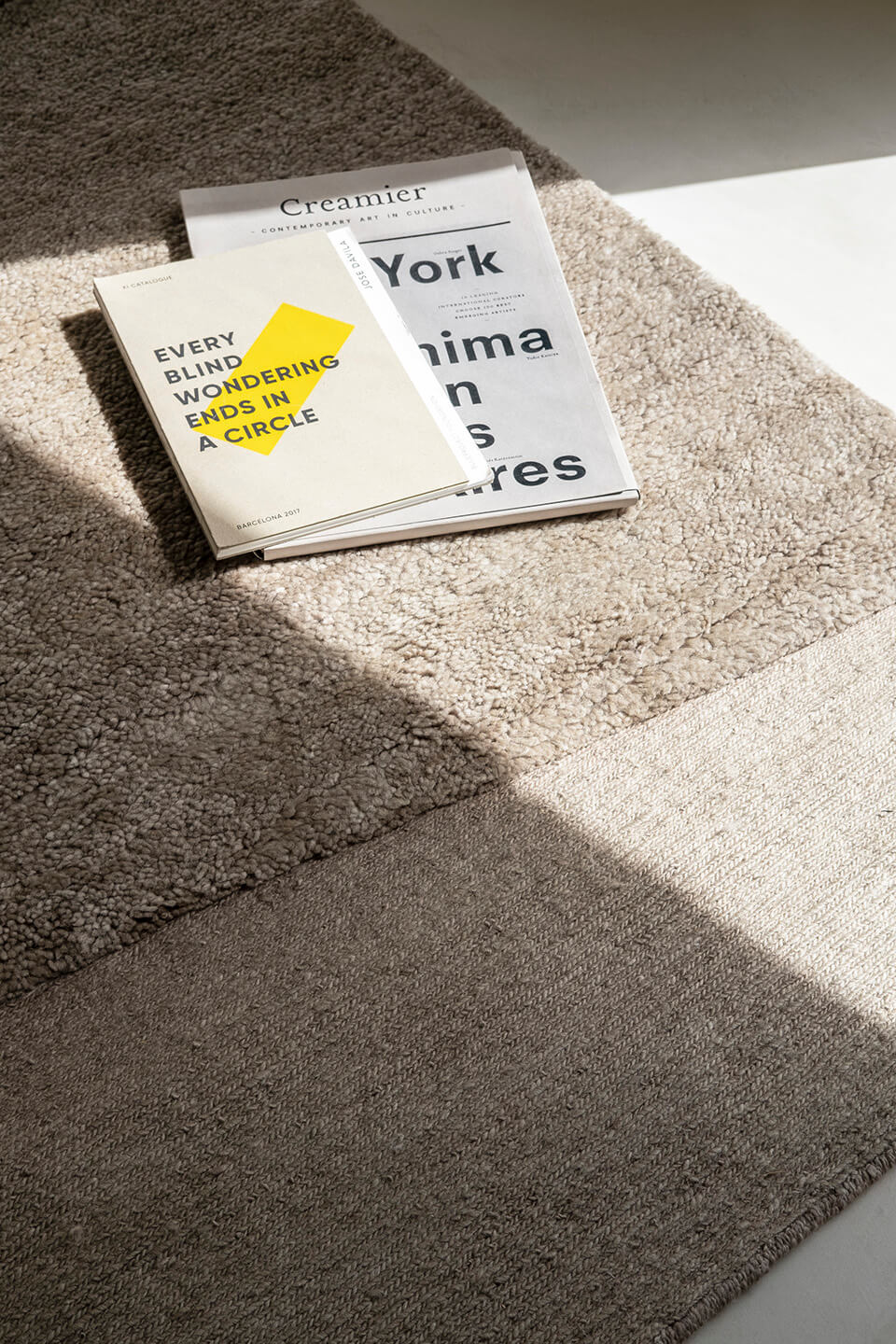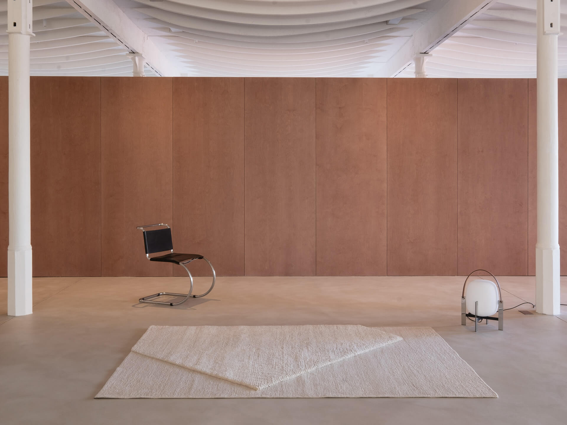 Its design, determined by the two clearly differentiated planes, was obtained through a combination of techniques and generation of textures. This subtle rug uses geometrical finesse to add volume to its surroundings.