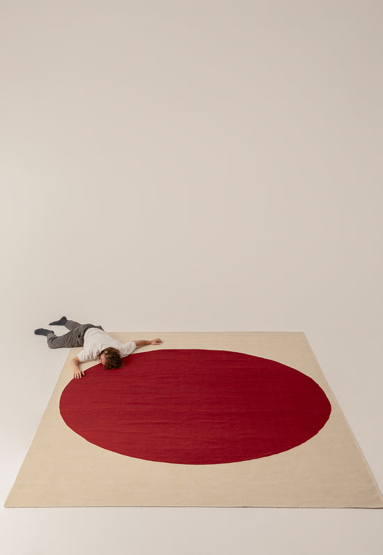 A large circle, positioned at the very edge of the rectangular area. A powerful visual tension. This simple gesture defines a space within a space: it delimits, organises, and at the same time invites one to recompose the surrounding environment.