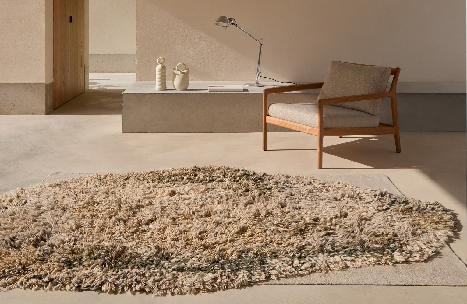 The Alga collection by Nani Marquina is an invitation to the senses, inspired by the fields of the sea. A rug that stands out for its organic shape, in motion, hand-knotted on a hand-woven dhurrie. But the complexity of the design goes beyond its form: the main challenge was to visually achieve a dynamic rug with such long fibers.